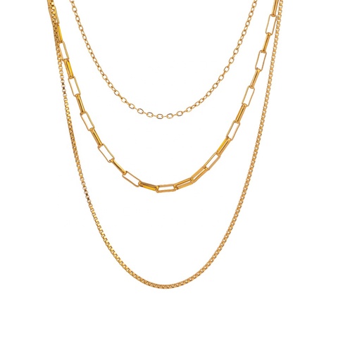 도매 인 빈티지 스타일 18k 금도금 종이 클립 체인 레이어드 목걸이 스테인레스 스틸 체인 3 층 목걸이